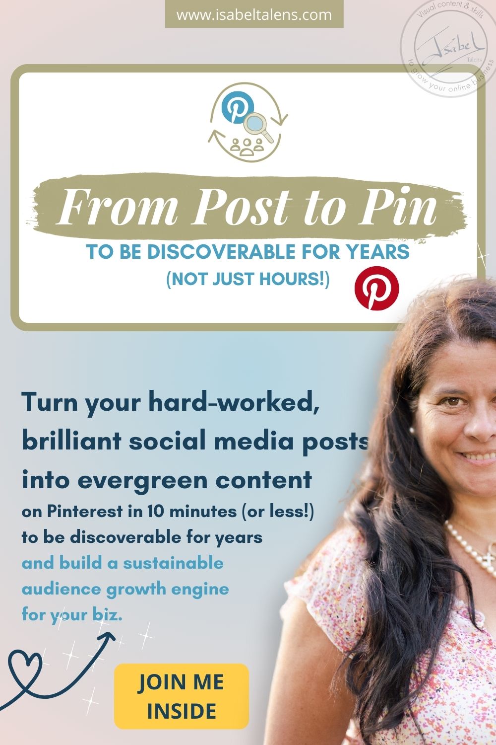 Turn your hard-worked, brilliant social media posts into evergreen content on Pinterest in 10 minutes (or less!) to be discoverable for years [not hours!]. Build a sustainable audience growth engine for your biz. Discover exactly how to go from post to pin smartly on Pinterest, so that your fantastic content works for you on autopilot. Hosted by Isabel Talens